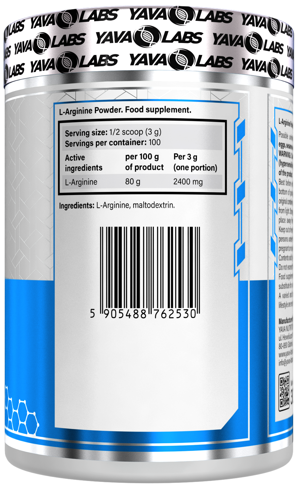 Przedtreningówka dla sportowców arginina L-Arginine proszek aminokwasy siła bezsmakowa Yava Labs to suplement diety, który dostarcza czystej, naturalnej formy aminokwasu L-argininy w łatwej do spożycia i wchłaniania formie. L-arginina, będąca aminokwasem endogennym, może być uzupełniana za pomocą suplementów diety, co przynosi szereg korzyści dla zdrowia i wydolności fizycznej.