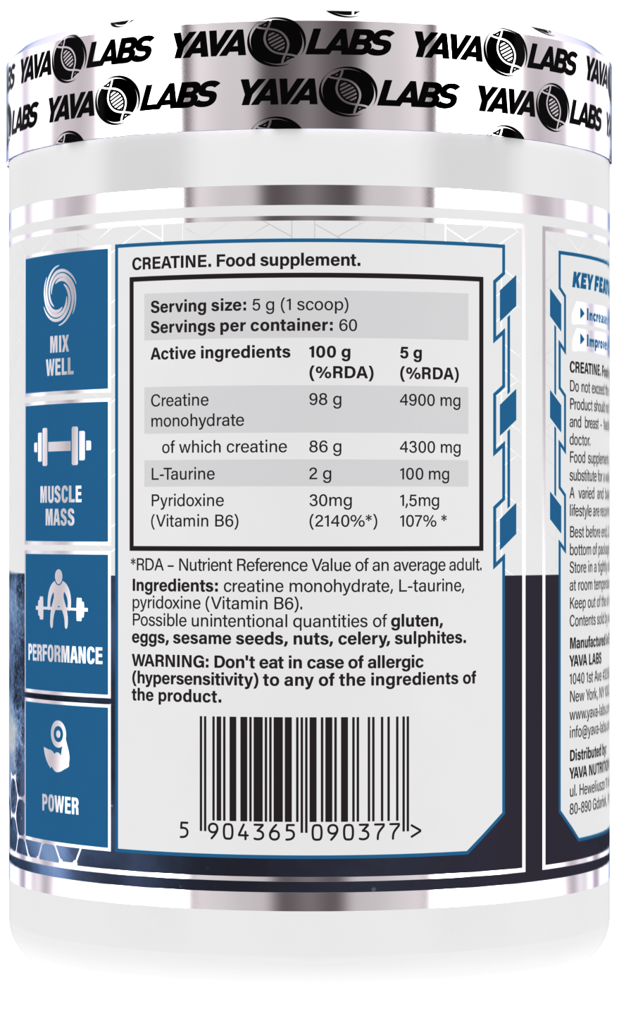 Yava Labs Creatine to wysokiej jakości suplement diety, który uzupełnia poziom monohydratu kreatyny w codziennej diecie i ma za zadanie poprawić siłę i wydolność. Używamy monohydratu kreatyny, najbezpieczniejszej, najskuteczniejszej formy kreatyny. Stosowana z powodzeniem od lat, przebadana i uznana przez wielu badaczy za najskuteczniejszą i najbezpieczniejszą formę. Nasza kreatyna jest w formie proszku, który jest lepiej rozpuszczalny w wodzie i lepiej wchłaniany do tkanek niż typowy monohydrat kreatyny. Podstawowym nośnikiem energii w komórkach mięśniowych jest cząsteczka kreatyny, co sprawia, że suplementacja jest wyborem ideologicznym. Przy regularnym stosowaniu nasz produkt poprawia wyniki sportowe poprzez zwiększenie siły, mocy i masy mięśniowej. Suplementy kreatyny zwiększają zapasy fosfokreatyny w mięśniach. Fosfokreatyna wspomaga tworzenie trójfosforanu adenozyny (ATP), głównej cząsteczki wykorzystywanej przez komórki do wytwarzania energii podczas intensywnych ćwiczeń. Jest to podstawowy mechanizm, dzięki któremu kreatyna poprawia wydajność.