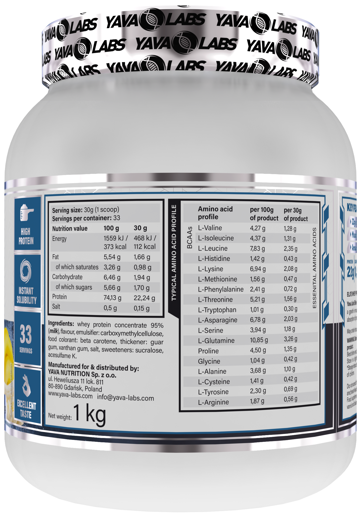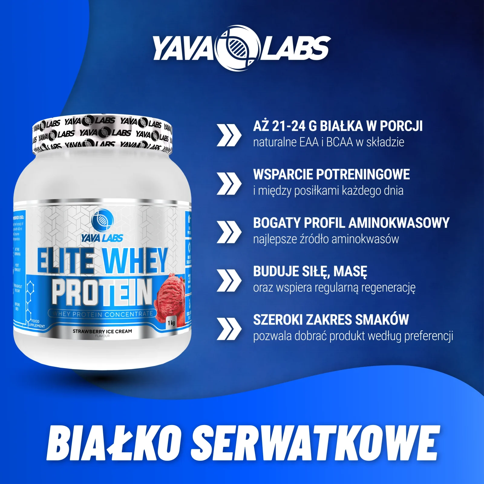 YAVA LABS – Elite Whey Protein bialko 1kg to najwyższej jakości białko whey protein dla sportowców, które dostarcza aż 22 g czystego białka serwatkowego w jednej porcji. To produkt stworzony dla osób, które chcą skutecznie budować masę mięśniową, poprawiać regenerację i wspierać swoje cele treningowe – bez kompromisów w smaku czy składzie.