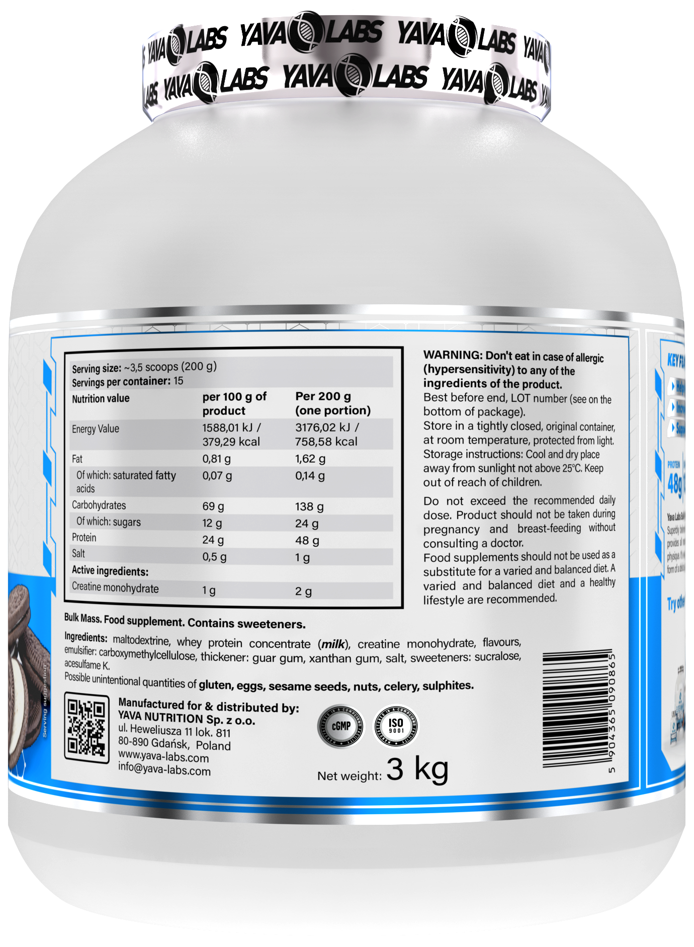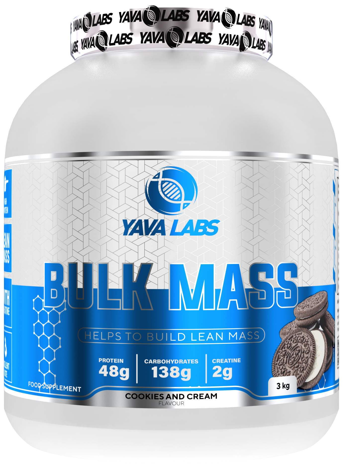 Bulk Mass firmy Yava Labs to suplement diety opracowany na bazie łatwo przyswajalnych węglowodanów, który dostarcza organizmowi dużej ilości  energii  potrzebnej podczas treningów. Pomaga ludziom uzyskać dodatkowe kalorie potrzebne do budowy mięśni. Zawiera również duże ilości zdrowego białka pochodzącego z mleka. Twoje mięśnie nie uszczuplą  aminokwasów  potrzebnych do szybkiego wzrostu i regeneracji, dzięki izolatowi białka serwatki .