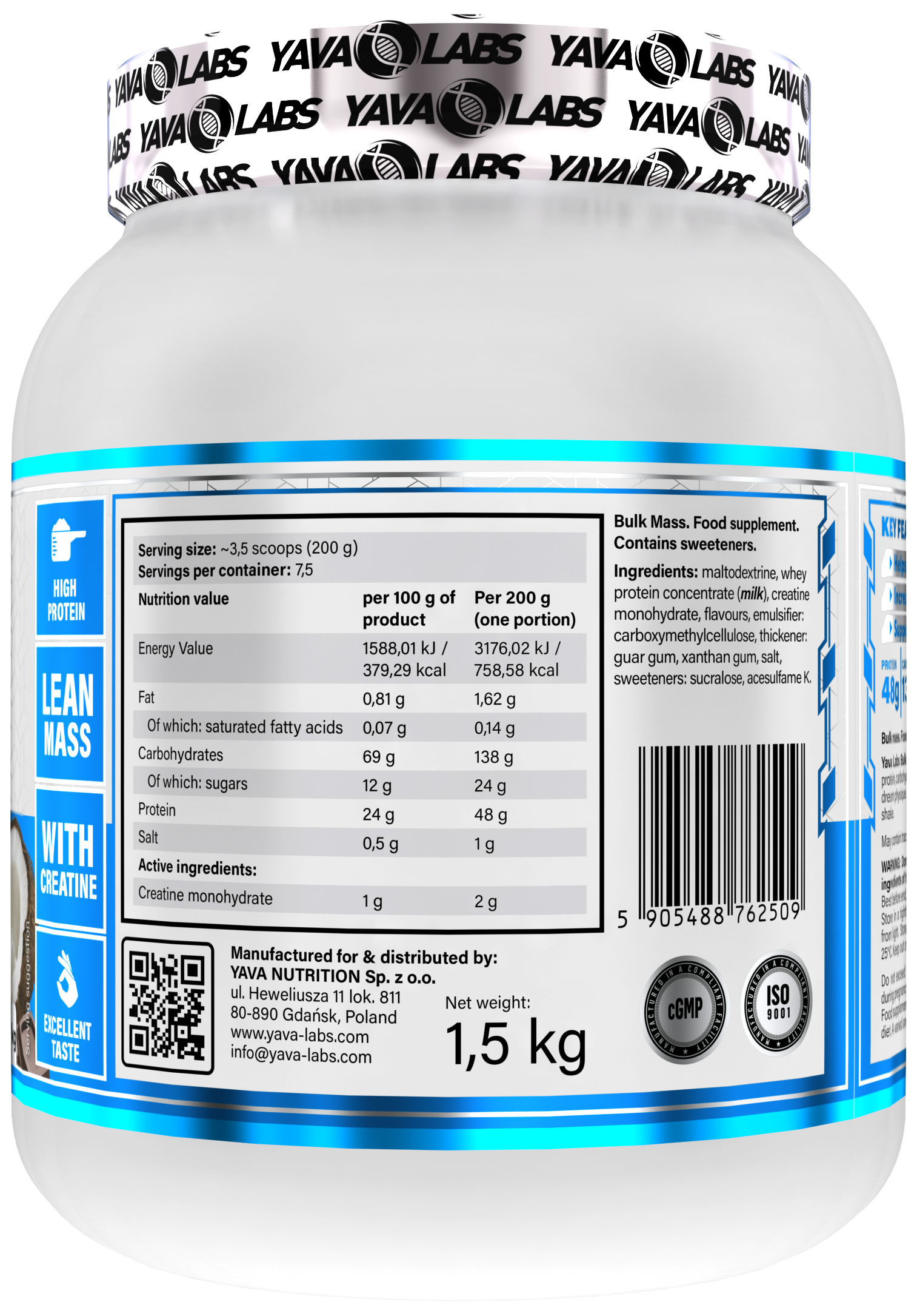 Bulk Mass firmy Yava Labs to suplement diety opracowany na bazie łatwo przyswajalnych węglowodanów, który dostarcza organizmowi dużej ilości  energii  potrzebnej podczas treningów. Pomaga ludziom uzyskać dodatkowe kalorie potrzebne do budowy mięśni. Zawiera również duże ilości zdrowego białka pochodzącego z mleka. Twoje mięśnie nie uszczuplą  aminokwasów  potrzebnych do szybkiego wzrostu i regeneracji, dzięki izolatowi białka serwatki .