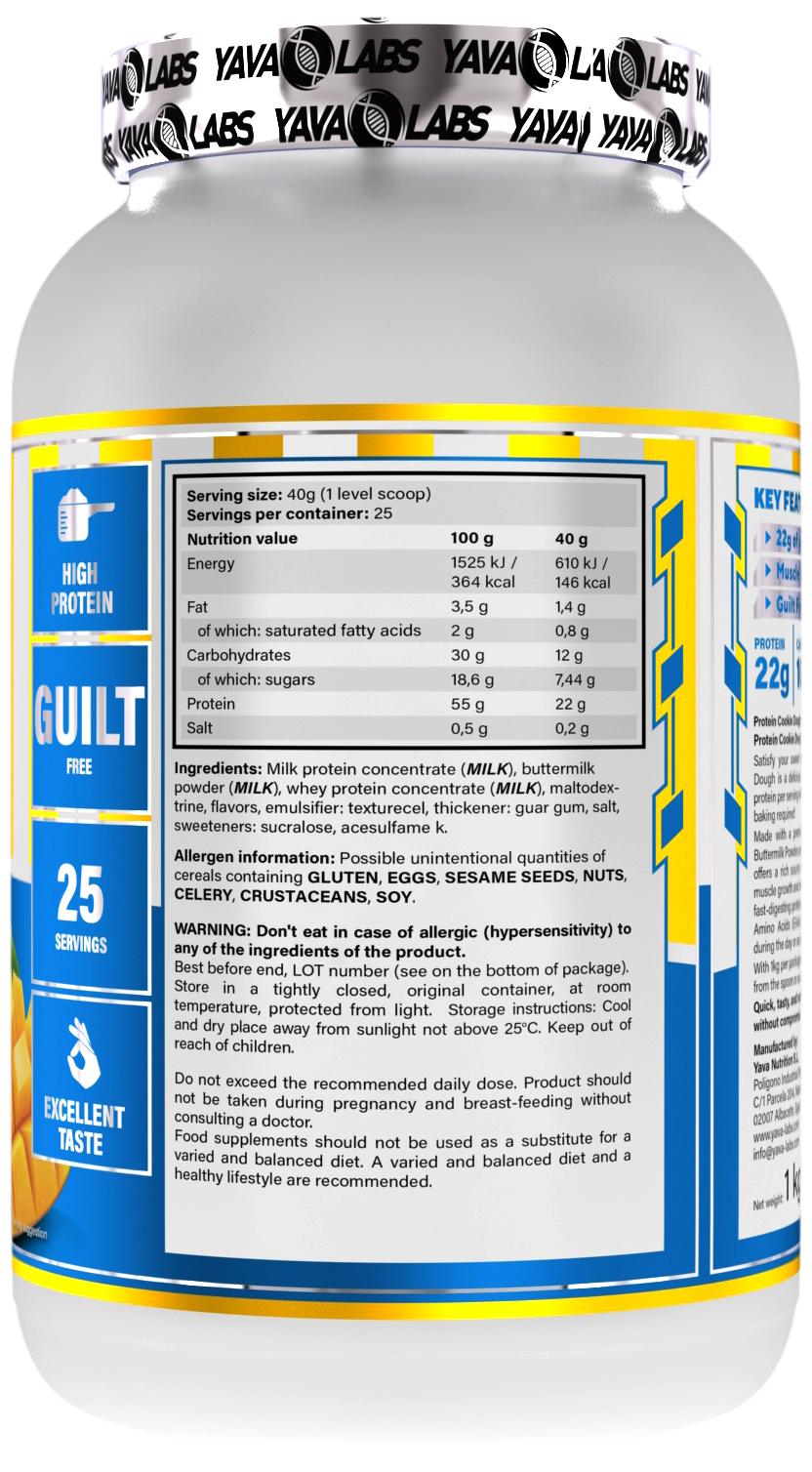 Yava Labs Protein Cookie Dough 1kg – Ciasteczka mango to innowacyjny sposób na dostarczenie wysokiej jakości białka w formie, która zachwyca smakiem i teksturą. Produkt wyróżnia się kremową konsystencją przypominającą ciasto na ciasteczka, dzięki czemu możesz cieszyć się zdrową, pełnowartościową przekąską, która jednocześnie wspiera Twoje cele treningowe.