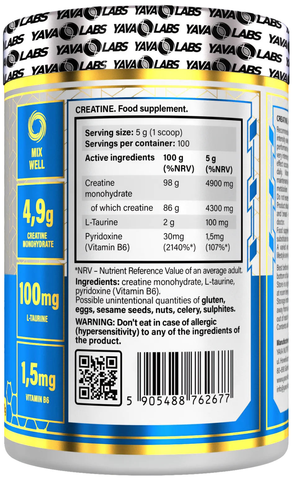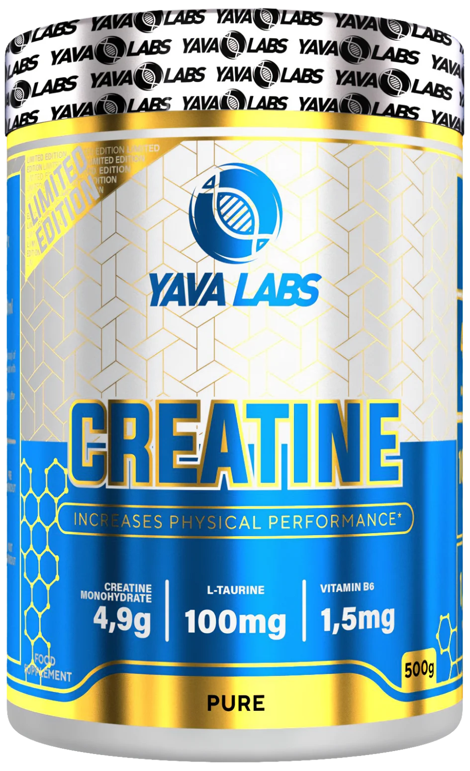 Yava Labs Creatine Pure 500 g to suplement diety stworzony z myślą o osobach dążących do maksymalnych wyników sportowych. Każda porcja zawiera 4,9 g monohydratu kreatyny, która wspiera wzrost siły mięśniowej, poprawia wydolność i pozwala trenować intensywniej. Dodatkowo formuła została wzbogacona o 100 mg L-Tauryny wspomagającej regenerację oraz 1,5 mg witaminy B6, która wspiera prawidłowy metabolizm energetyczny i zmniejsza uczucie zmęczenia.