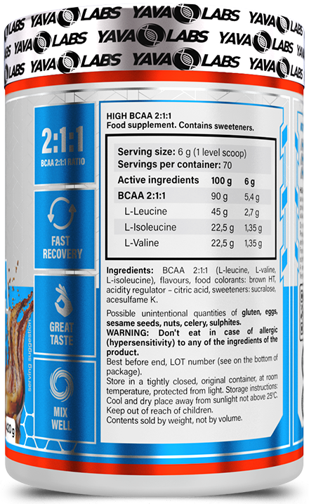 Szukasz sposobu, żeby Twoje treningi były jeszcze efektywniejsze, a regeneracja szybsza niż kiedykolwiek? Yava Labs High BCAA to Twój tajny składnik! Ten suplement diety to prawdziwa bomba aminokwasowa BCAA dla sportowców w idealnych proporcjach 2:1:1. Ma na celu dostarczenie mięśniom optymalnej równowagi leucyny, izoleucyny i waliny, a dodatkowo ten suplement dostępny w pysznych smakach jest łatwy w przygotowaniu i idealny do spożycia przed, w trakcie lub po treningu.
